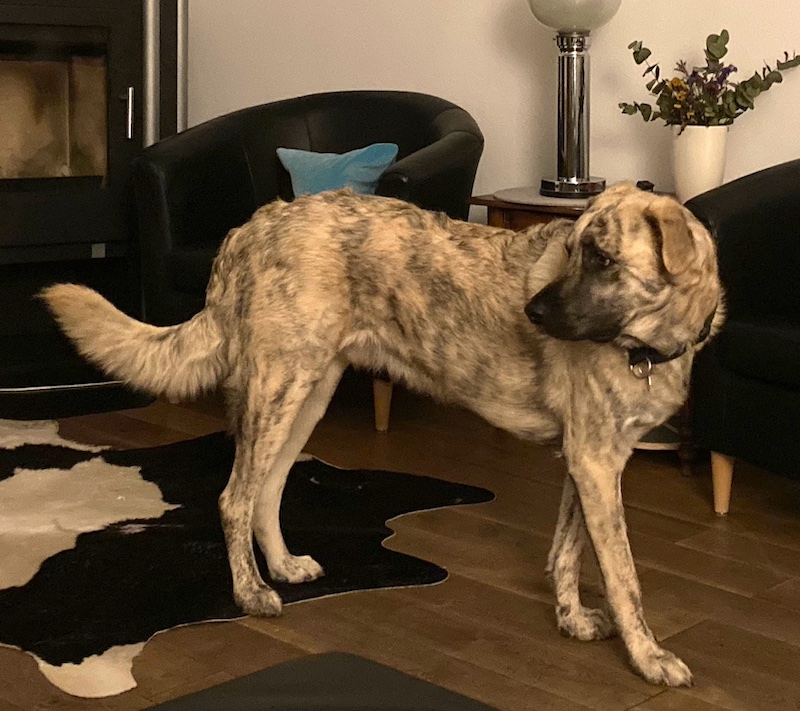 Unsere entspannten Praxishunde: Bela (Dogo Sardo, Herdenschutz): Der getigerte Jungspund seit 6.10.24